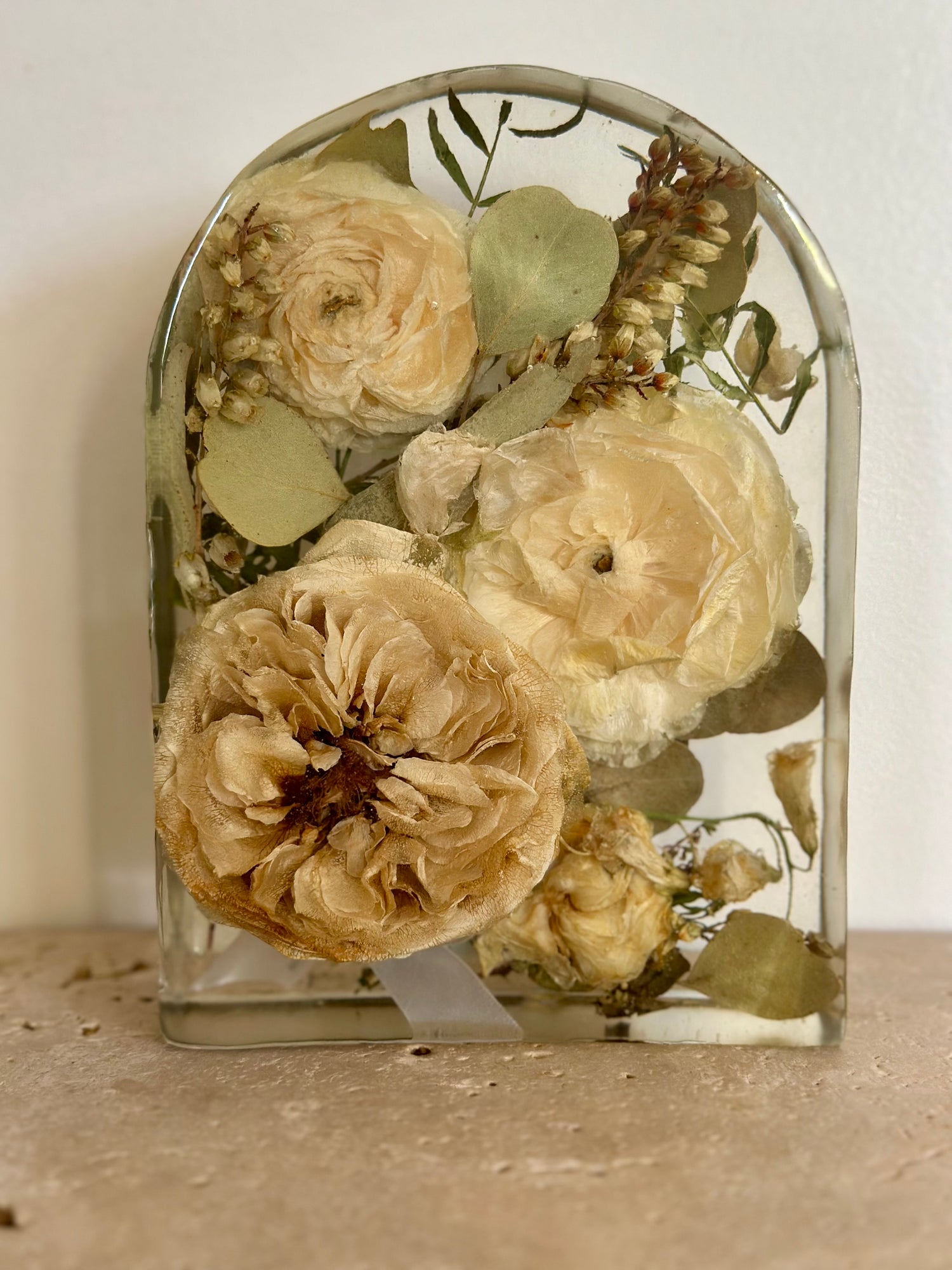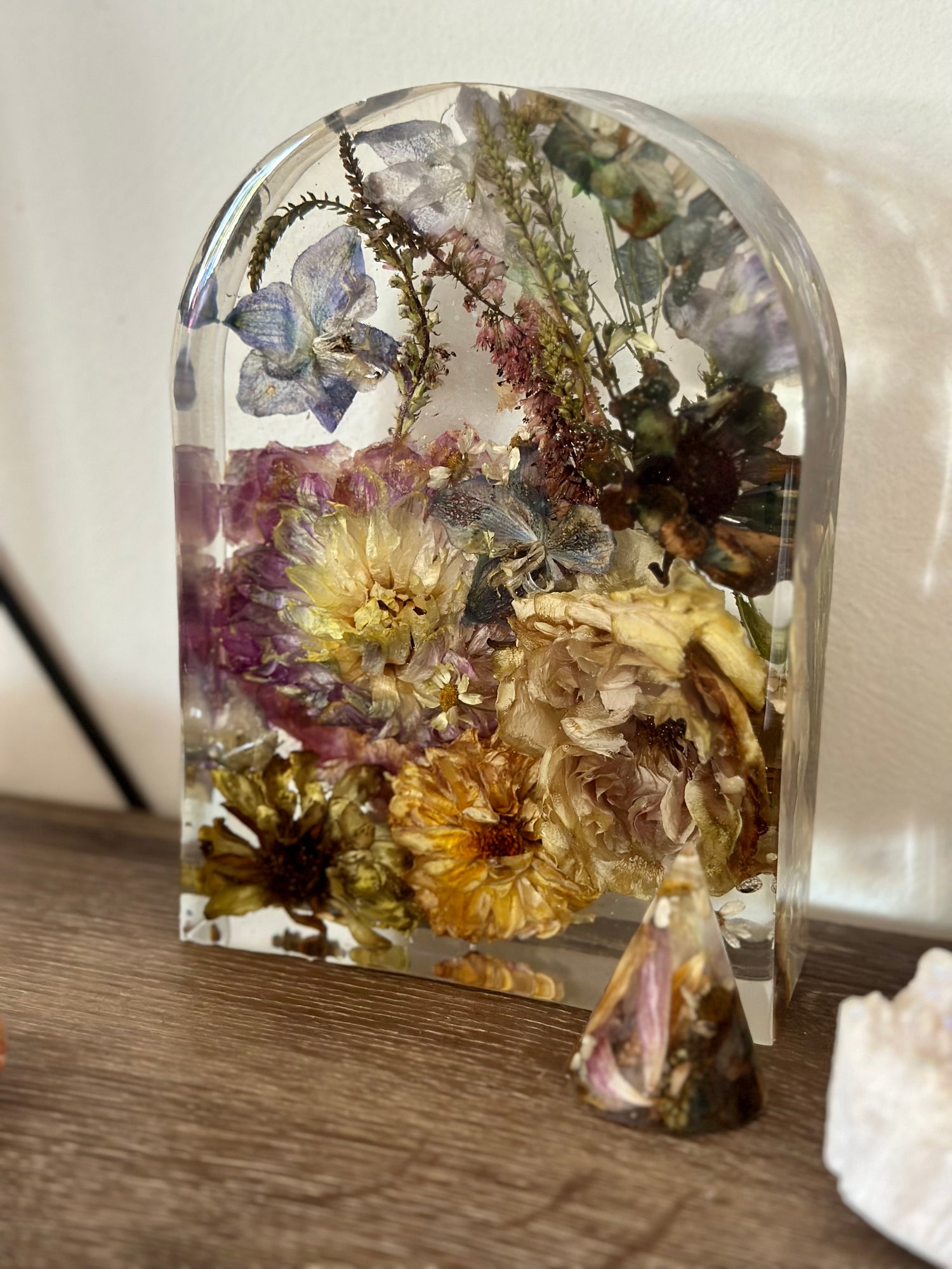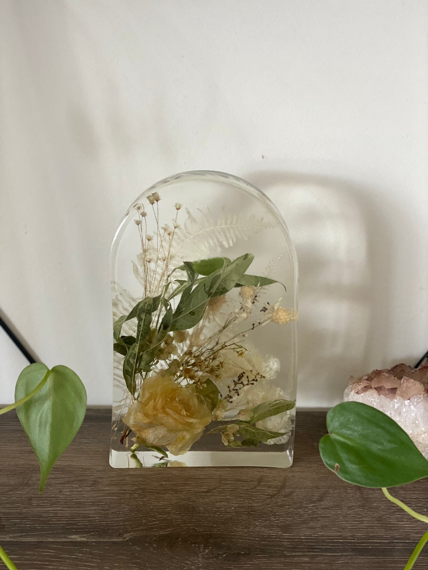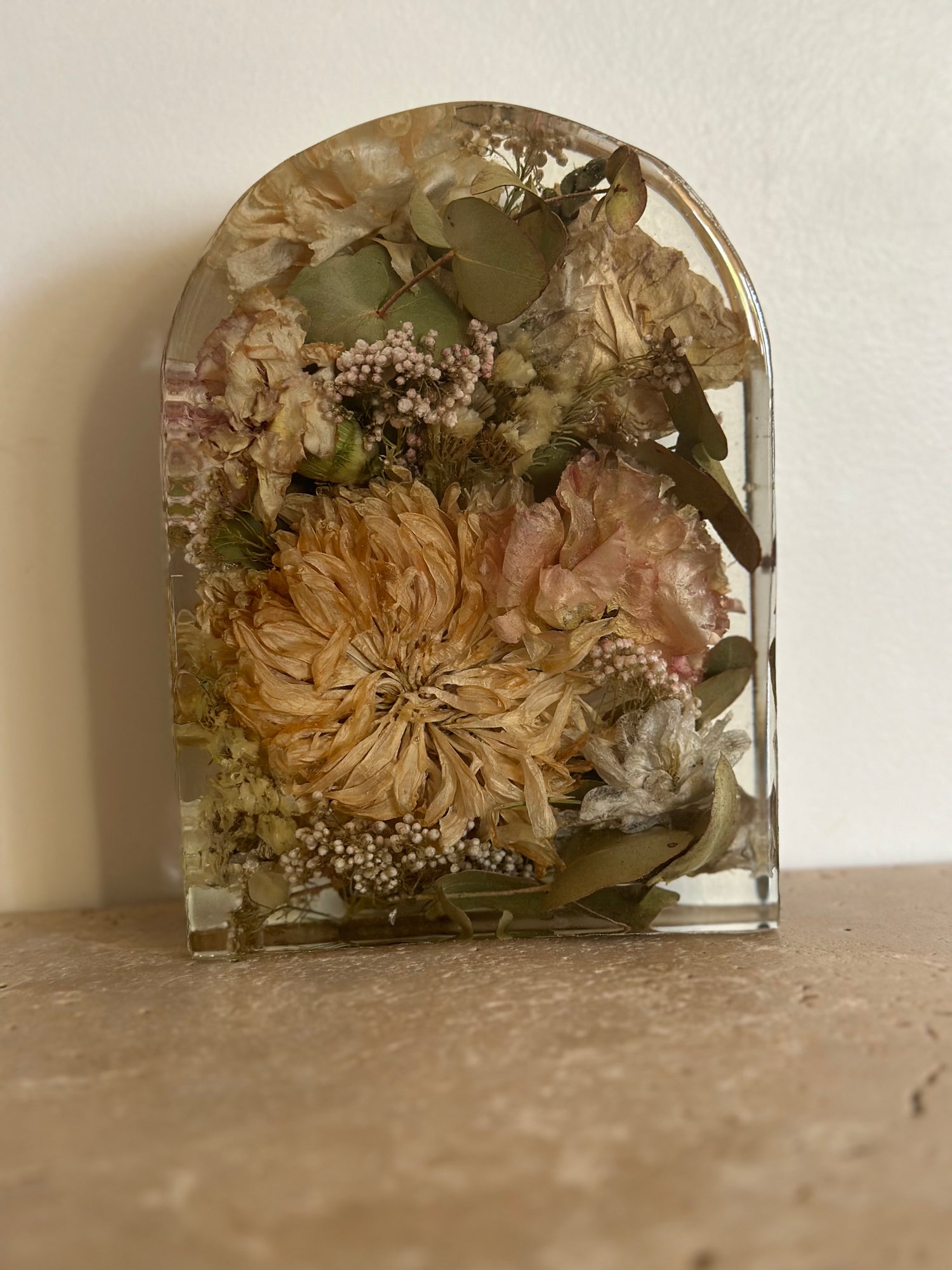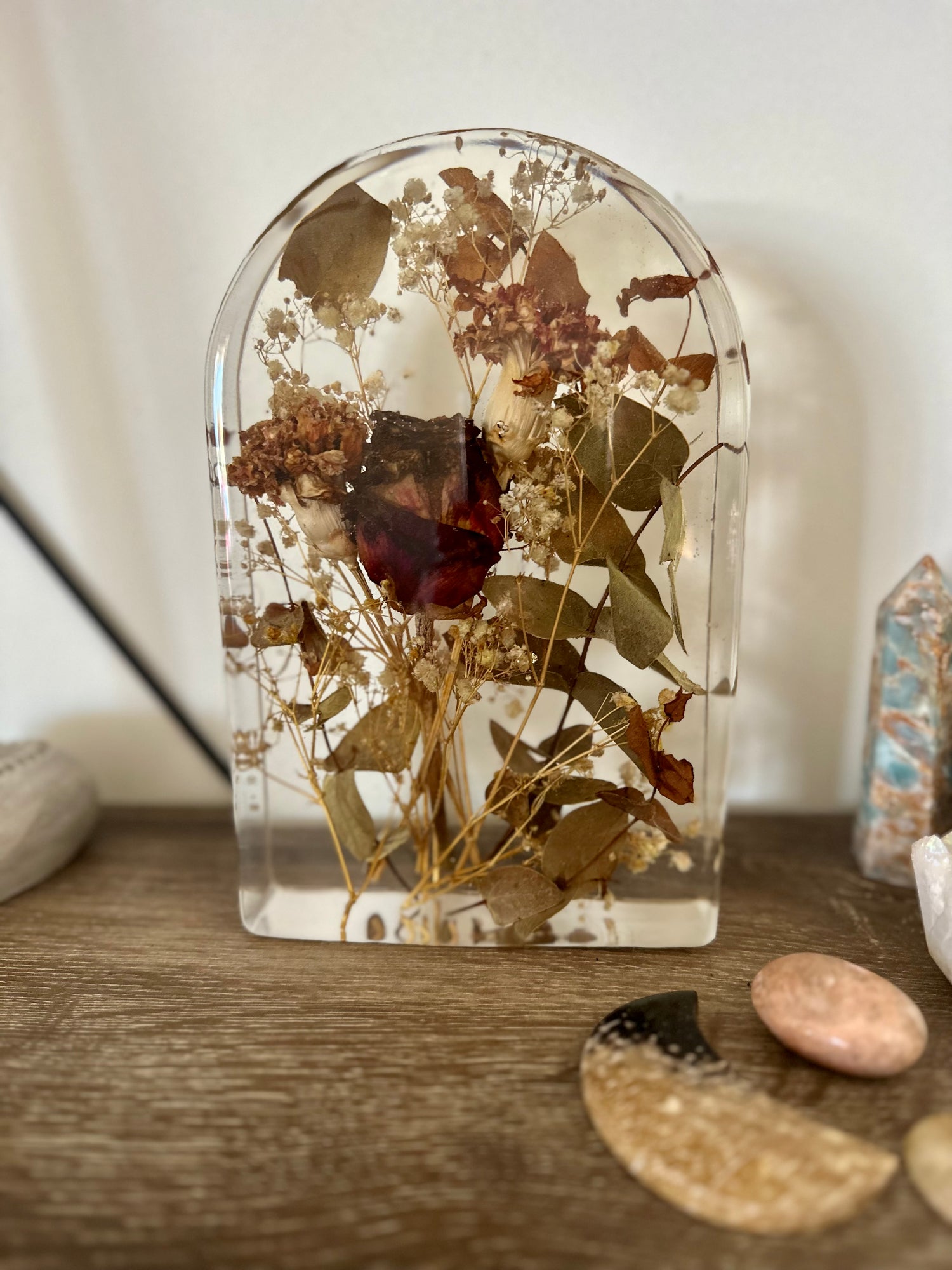 These original Eclectic Creative Designs Arch Flower Preservations are made with the highest quality decorative resin art and are perfect to turn your special occasion flowers in a timeless keepsake. Whether it be a wedding bouquet, birthday flowers, funeral flowers, they will be cherished displayed on your mantle piece, bedside table or on a shelf.