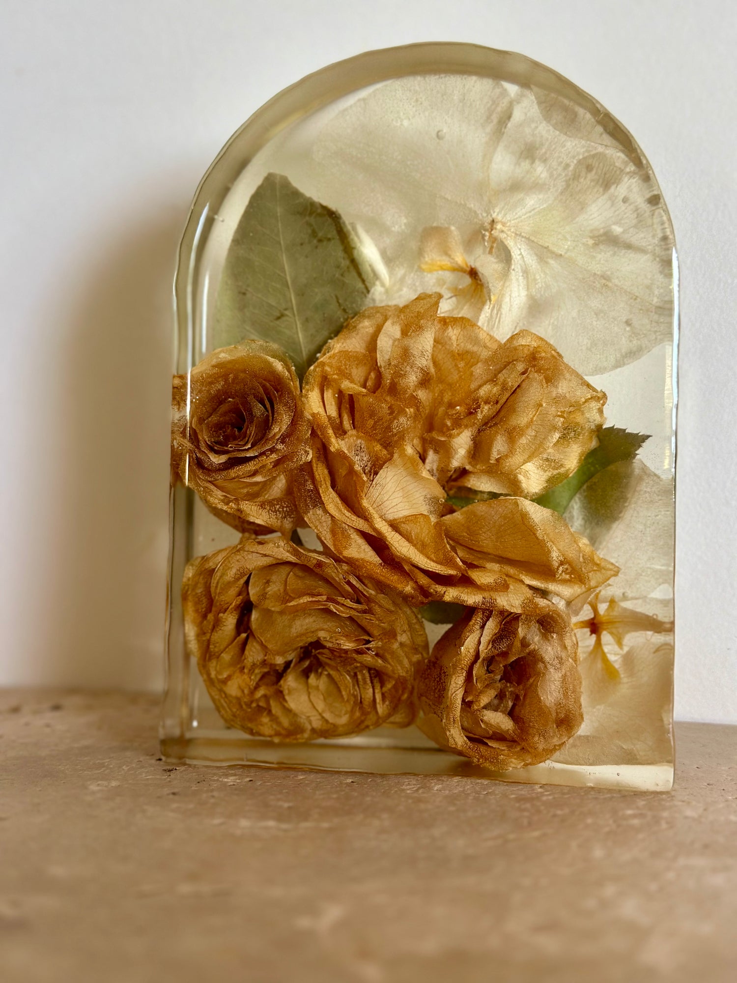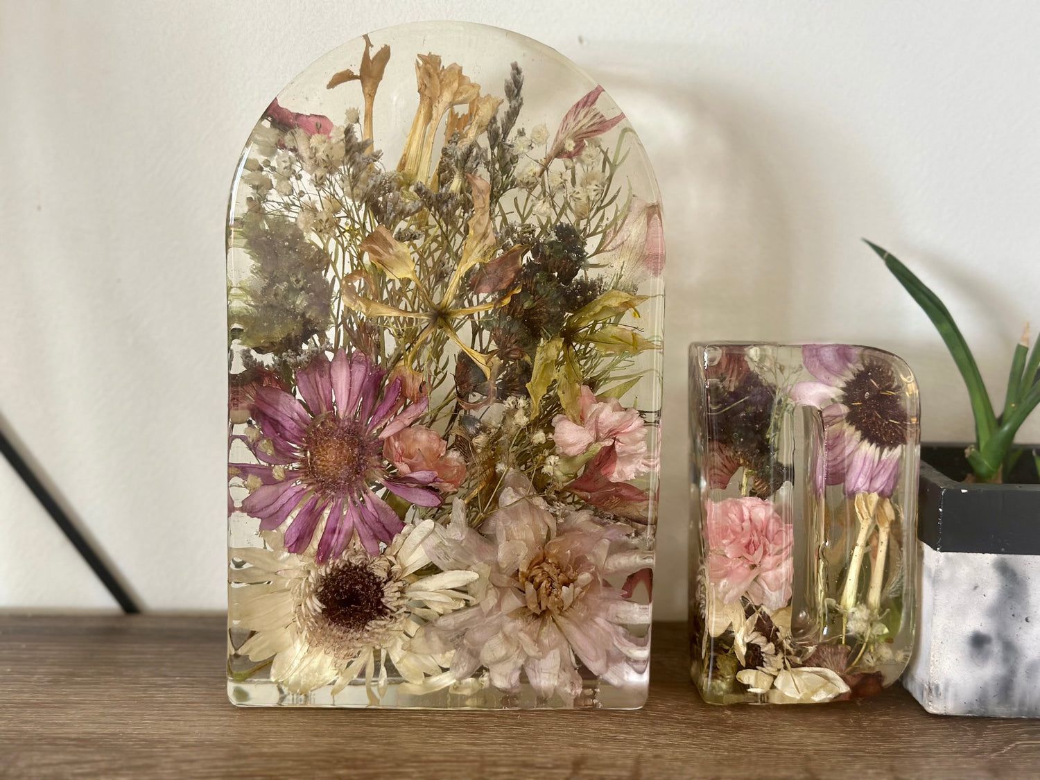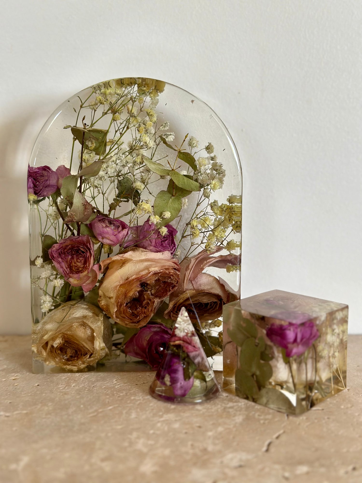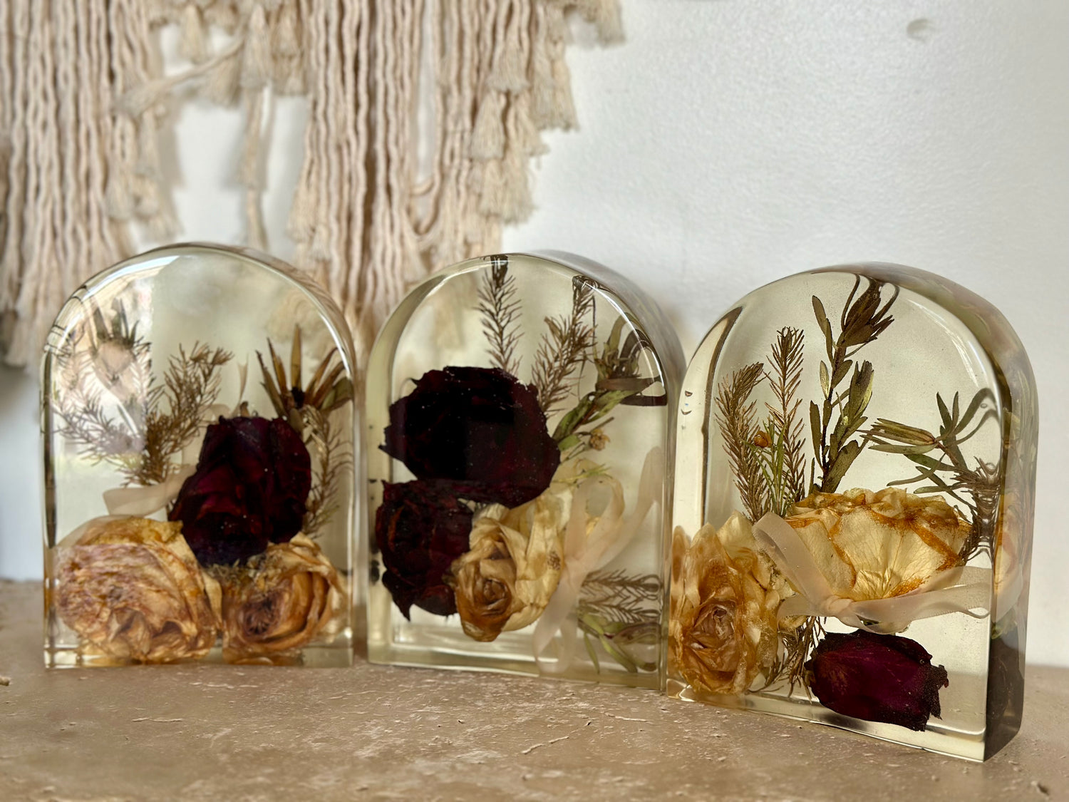 These original Eclectic Creative Designs Arch Flower Preservations are made with the highest quality decorative resin art and are perfect to turn your special occasion flowers in a timeless keepsake. Whether it be a wedding bouquet, birthday flowers, funeral flowers, they will be cherished displayed on your mantle piece, bedside table or on a shelf.