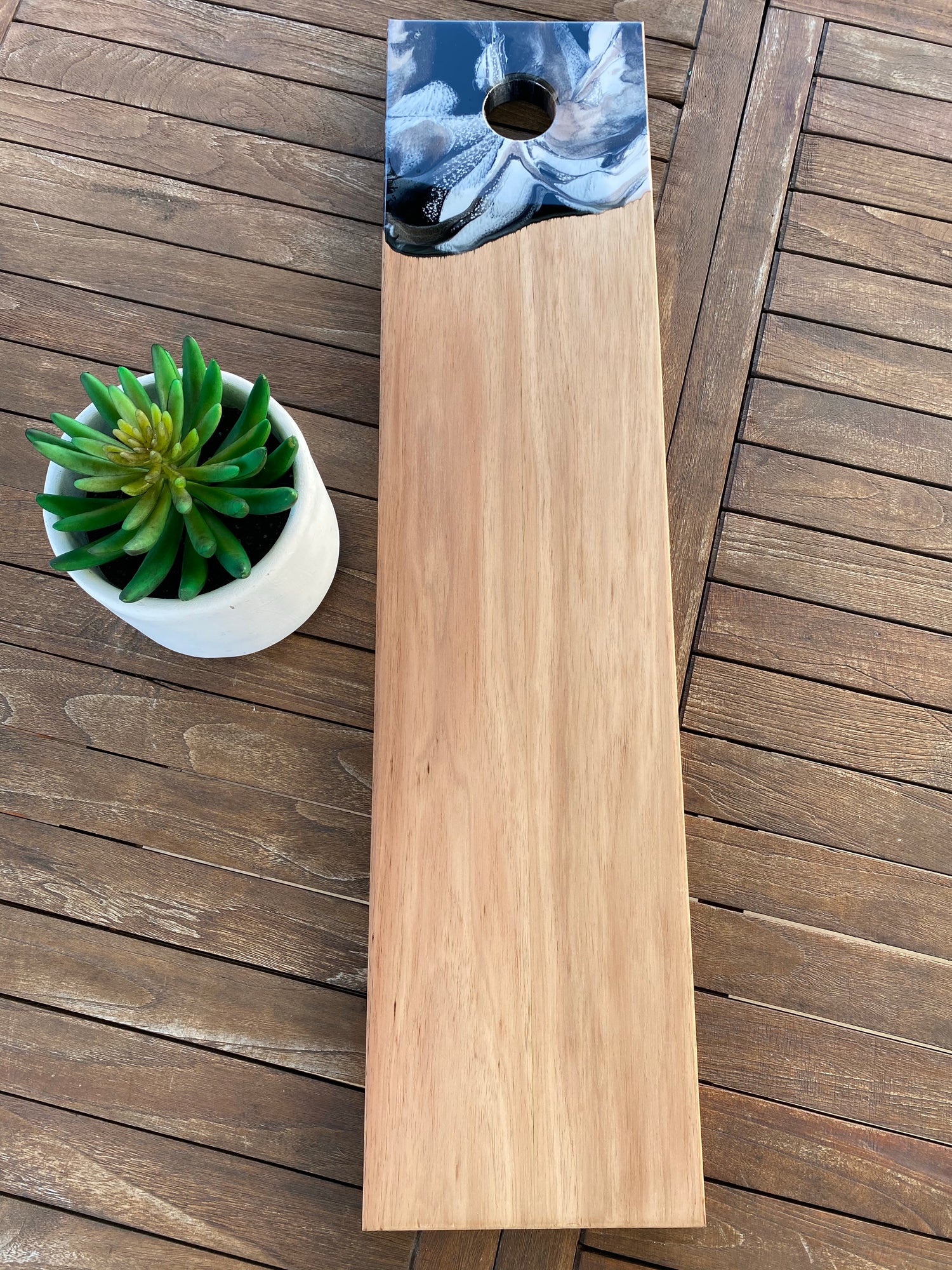 This original Eclectic Creative Designs serving board/cheese board is sustainably made from Tasmanian Blackwood right here in Australia and is covered with the highest quality decorative resin art on the handle. This one of a kind serving board/cheese board can be used for serving cheese or other foods and creates a unique way to serve food.