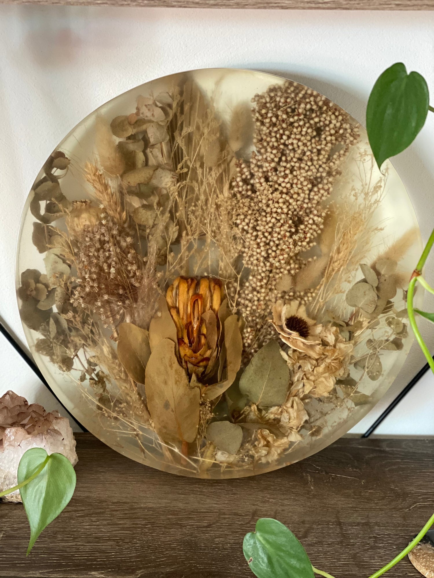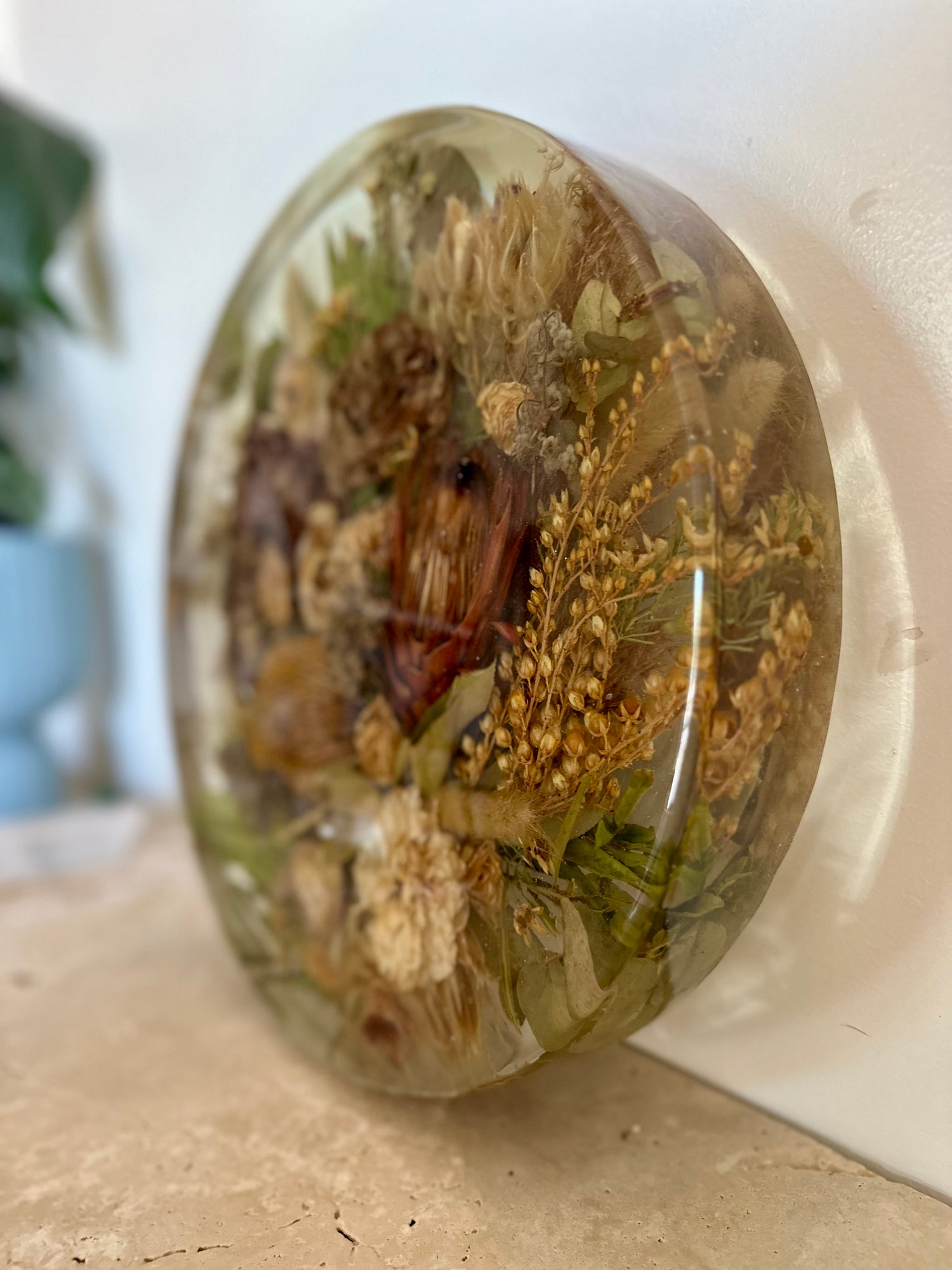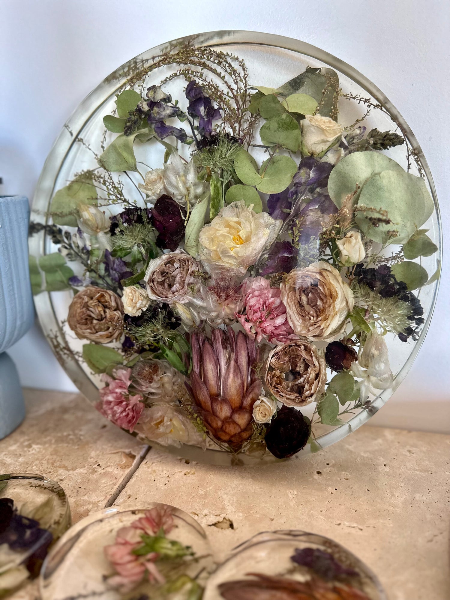 These original Eclectic Creative Designs Round Flower Preservations are made with the highest quality decorative resin art and are perfect to turn your special occasion flowers in a timeless keepsake. Whether it be a wedding bouquet, birthday flowers, funeral flowers, they will be cherished displayed on your mantle piece, bedside table or on a shelf.
