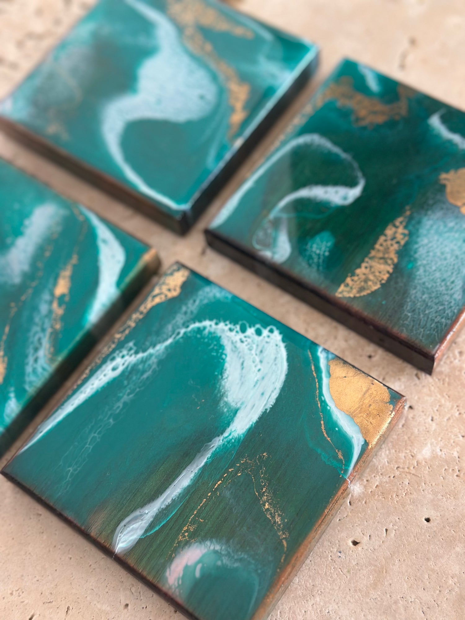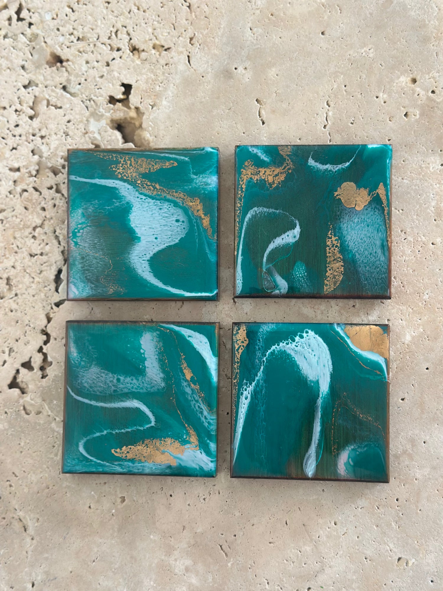 These set of four original Eclectic Creative Designs coasters are aluminum based and covered with the highest quality decorative resin art with hand painted metallic edges. They are them super lightweight and unbreakable.